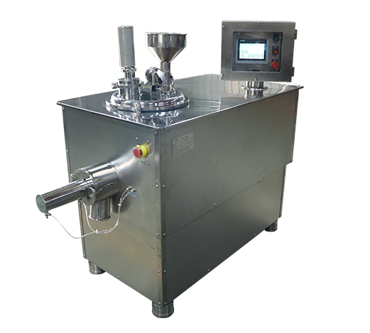 本機(jī)用于制藥工業(yè)中的固體制劑生產(chǎn),集傳統(tǒng)制粒工藝中的混合和制粒兩道工序與一體同時(shí)進(jìn)行,其制粒過程是先把粉料投入料筒內(nèi)經(jīng)攪拌漿形成翻滾狀態(tài),使不同性質(zhì)的粉料得到徹底的混合,然后逐量加入粘合劑。(通過攪拌漿和筒壁對(duì)物料的擠壓、揉合,使其形成潮濕均勻的軟材,同時(shí)經(jīng)制粒刀片的高速切割,逐步形成大小均勻的顆粒,最后由出料口排出,顆粒目數(shù)的大小由制粒刀的轉(zhuǎn)速和制粒時(shí)間控制)。